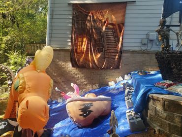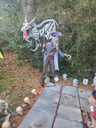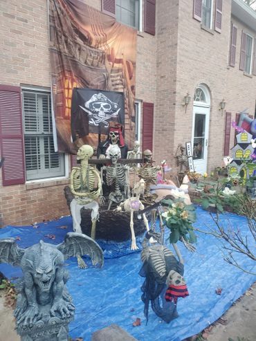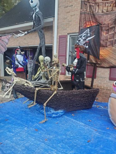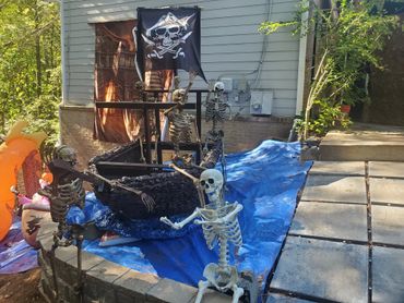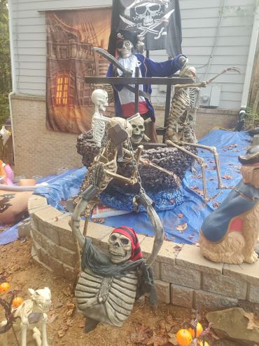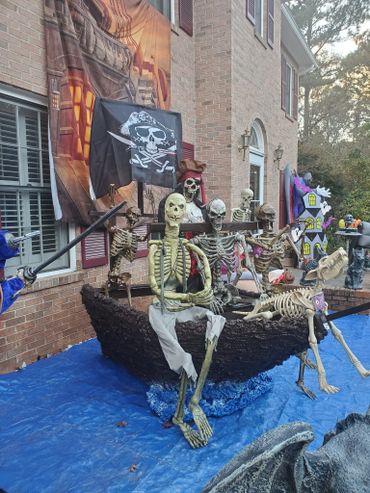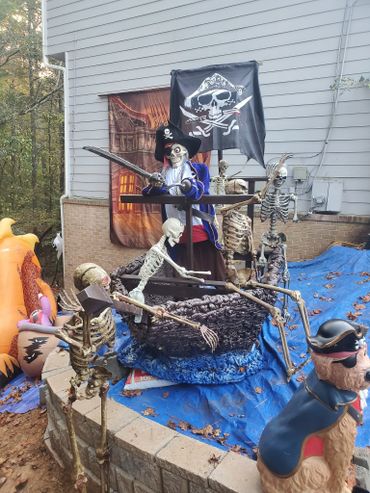 The last couple of Halloweens we have been expanding our Pirate presence. We built the front half of the pirate ship, added a backdrop, some pirate animatronics and several skeletons. ... Maybe next year will be the year we put a back on the boat?